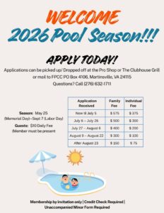 Call us at 276-632-1711 or email us at inquiries@forestparkcc.org with any questions and for more details. Available to members for private pool parties.